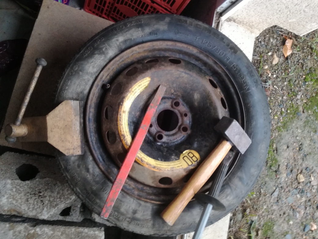 Puis cet après-midi à l'abri de la pluie, dans mon garage, demontage du pneu de la galette du Multipla avec les moyens du bord, à l'ancienne!
