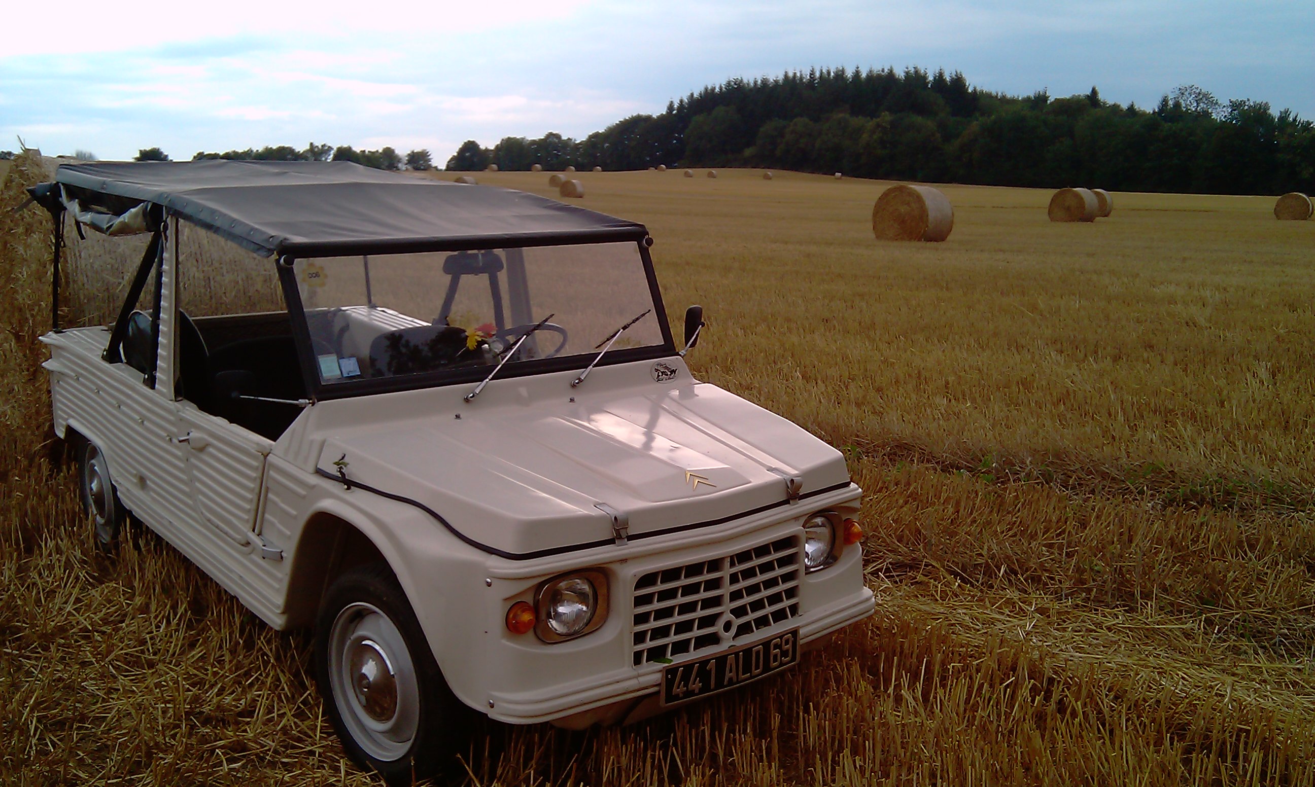 il est vrai que nous sortions de la baignade... Et puis en Méhari, les grosses fleurs ça fait un peu couleur locale, non ? J'en connais qui en mettent sur des autos bien plus récentes...