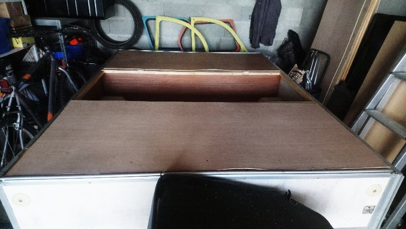 Puis pose des dessus de coffre. Hélas réalisés en CTP de 4.2 mm au lieu de 5 mm demandé. Ça a l'air de rien mais ça fait bien plus flexible.