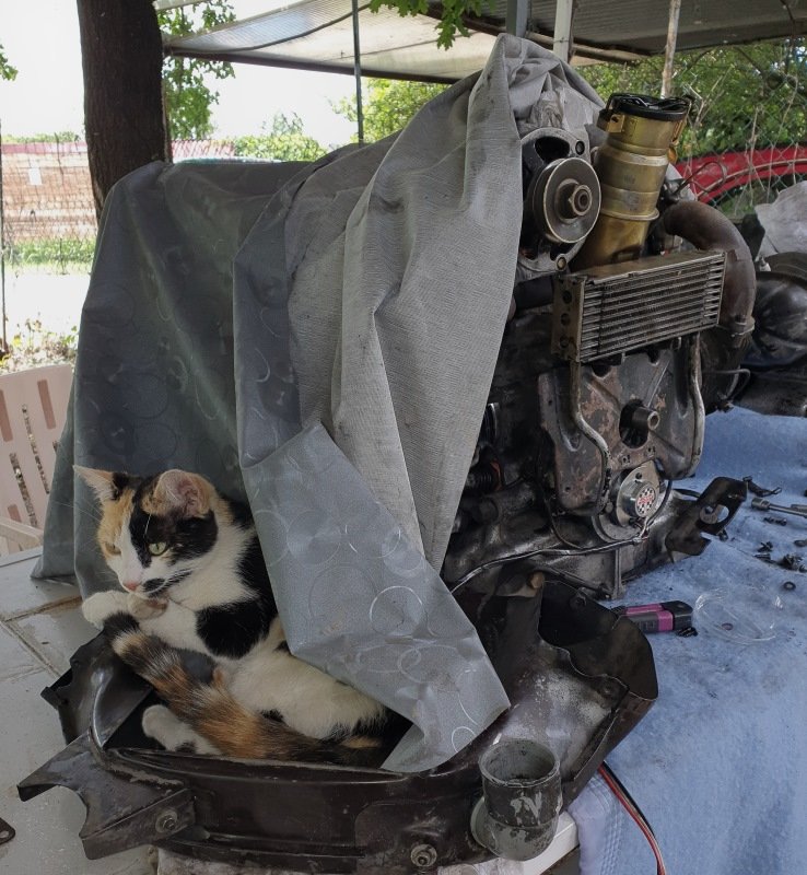 Va bosser sur un moteur avec chat ! Bon, à part le chat toujours fourré dans mes pattes, le moteur avance bien. Ce matin, j'ai déposé celui de la deuche pour récupérer certaines pièces et les greffer sur l'AK 2. J'ai quand même investi dans un embrayage neuf pour ne pas re-démonter dans six mois ou un an !Demain, je vais à l'anniversaire de ma Poupée (10 ans déjà !) et je pense remonter le moteur jeudi matin. Thierry, si tu as soif, passe donc me voir .... Biz à tous ! zoubi
