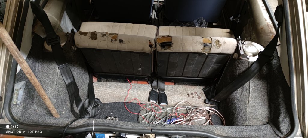 Dans le souci d'améliorer l'équipement de cette fausse GT, j'ai décidé de virer l'affreuse banquette AR en skaï pour lui mettre 02 sièges AR séparés et rabattables.