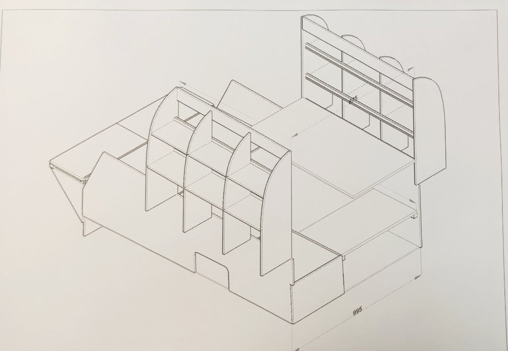 Une table, deux coffres sous banquettes dont un avec un tiroir et 2 étagères de rangement. Une extension vers l'avant relevable qui imposera des sièges rabattables à définir.