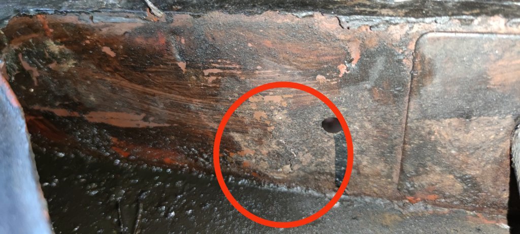Juste ici, derrière un renfort sur le chant du châssis, vers les fixations de train AV, un point de rouille perforante qui a bouffé la tôle côté intérieur. Il faudra y greffer une rustine.