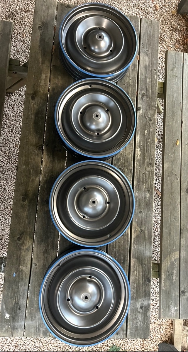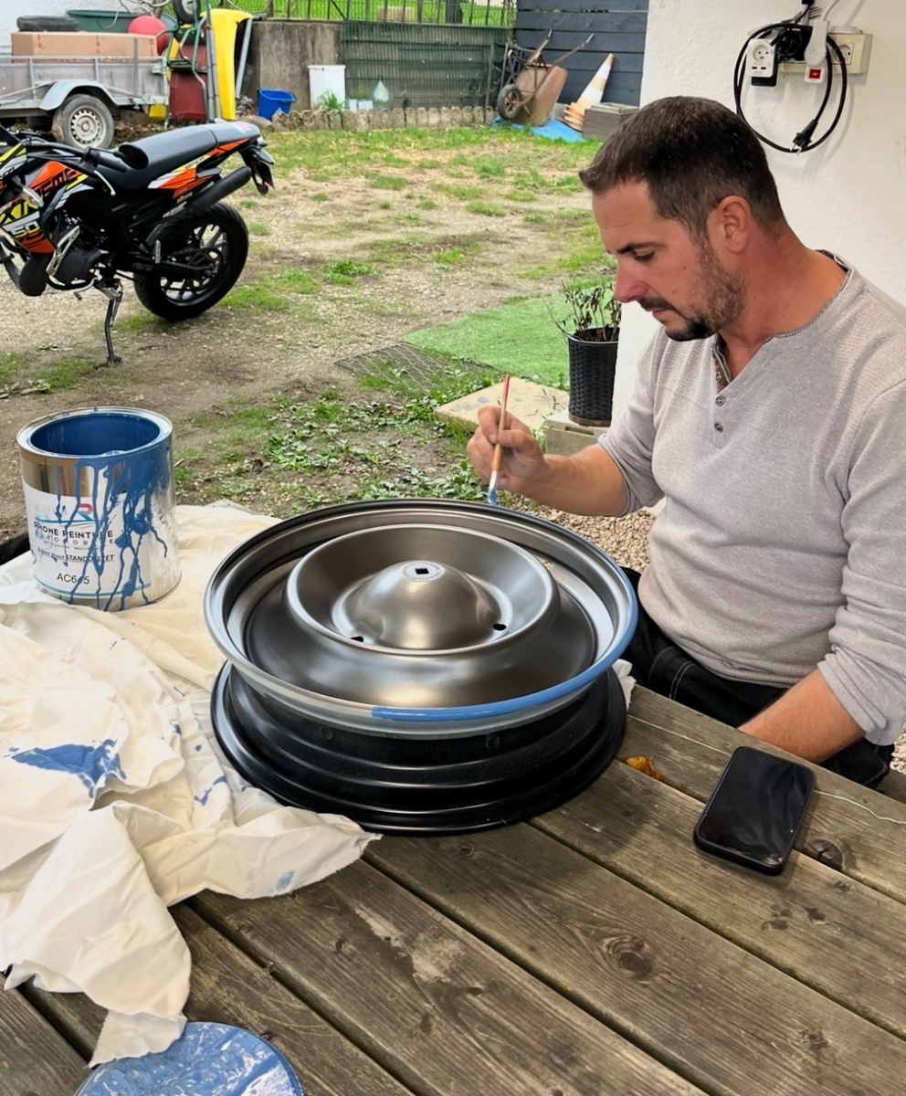 Aujourd’hui c’était peinture à la bombe des jantes en gris métallisé + liserés bleu myosotis. Maintenant, plus qu'à attendre époque auto pour récupérer les pneus et les monter.