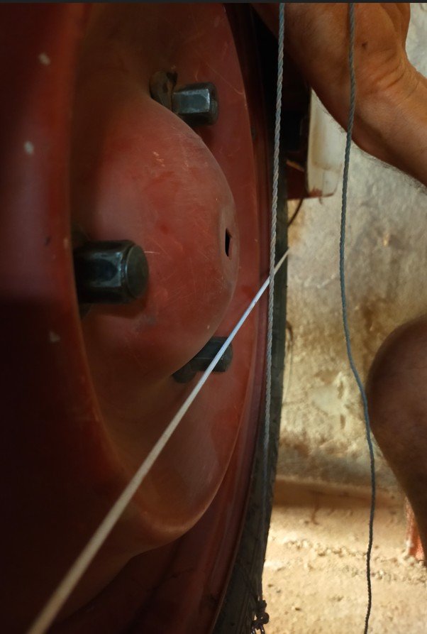 Le haut de la roue est complètement rentré dans l'aile. pour que le fil à plomb tangente le pneu en bas, j'ai du positionner à l'extérieur sur l'aile.