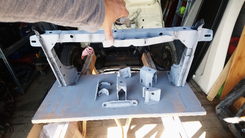 Cette jupe AV me crée moulte soucis. Elle est bien tordue. Difficile d'obtenir un truc nickel... Les ferrures et autres pièces peintes en noir AC200 ont pris un coup d'acide phosphorique en attendant l'arrivée de la peinture Sprido prévue lundi Et le pare chocs a eu droit à quelques coups de maillet sur la tronche histoire de le remettre droit dans ses baskets. Puis un coup de Belgom