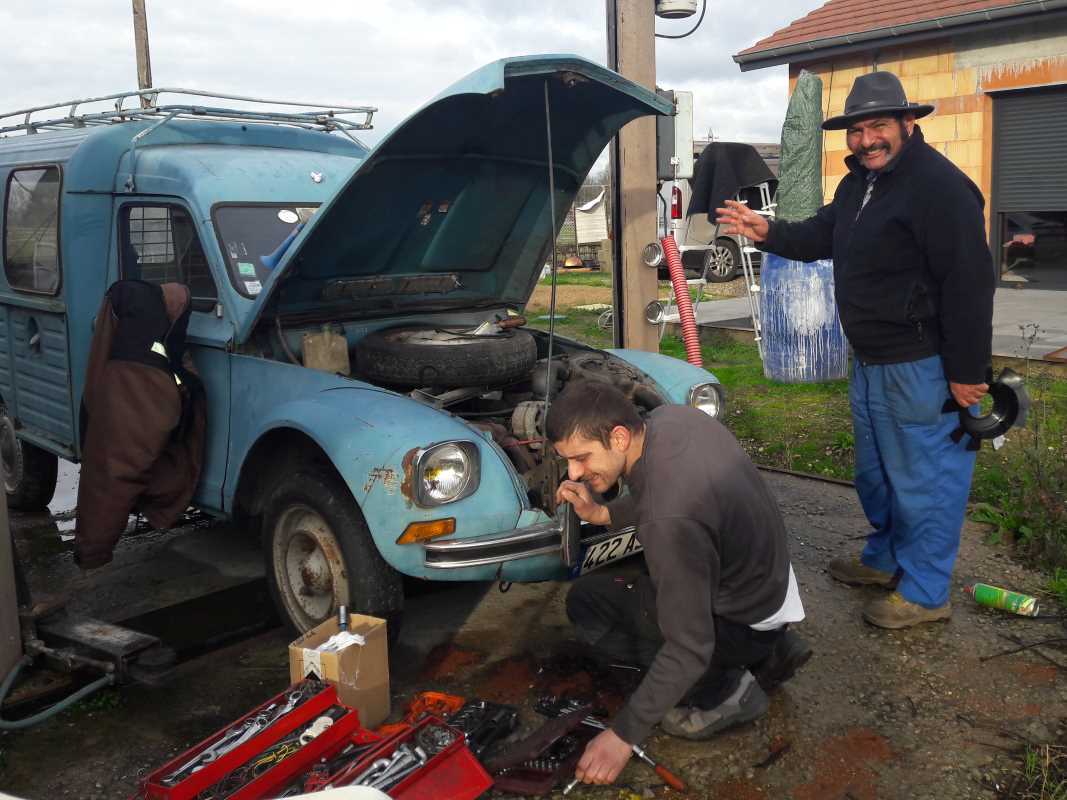 Poulossière en action pour changer les pneus de mon Acadiane… Je me suis fait la réflexion suivante en le regardant : Si Kiki n'avait pas de copain …………… Il serait peinard, non ?