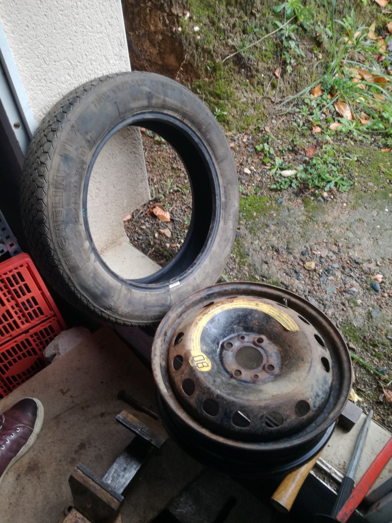 Puis cet après-midi à l'abri de la pluie, dans mon garage, demontage du pneu de la galette du Multipla avec les moyens du bord, à l'ancienne!