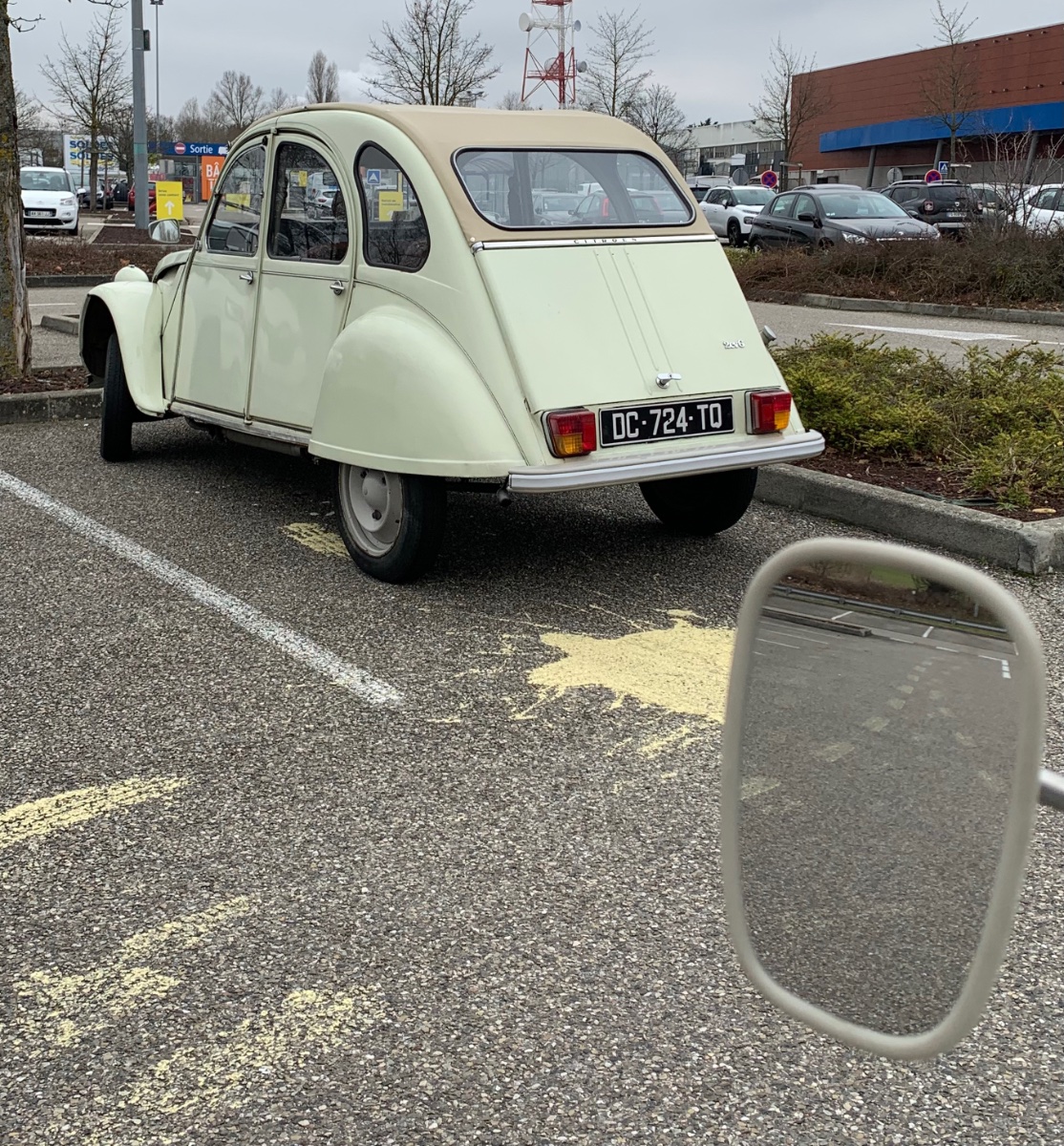 Superbe cette 2cv d'avant 1975 ! Petits pares-chocs; monogramme en relief; barre d'optiques "courtes"; charnière de malle avec l'inscription Citroën; joncs sur les bas de caisse; cuvelage des clignotants et supports des feux arrière en gris rosé ! Par contre il faudrait mettre les bavettes, cela protège beaucoup l'auto !