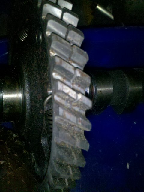 Comme la distribution ne doit pas avoir de jeu, la solution est un pignon double avec un ressort qui maintiens les dents décalées l'une de l'autre.