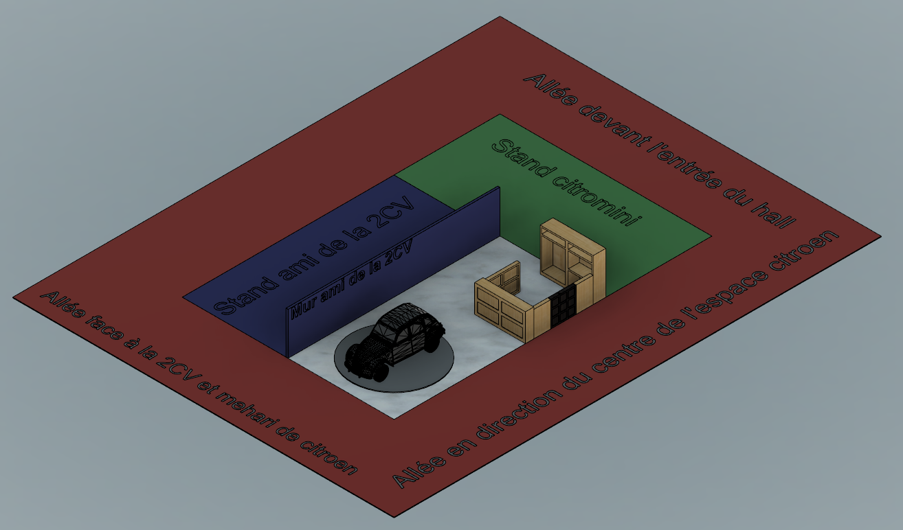 Pour rappel, même si ça a l'air compliqué ce que j'ai fait, ceci n'est que la représentation de ce que nous avons (ou aurons) à époqu'auto ! Il faudra voir quoi mettre contre le mur des ami de la 2CV et de citromini et après bien sur l'habillage du stand ^^