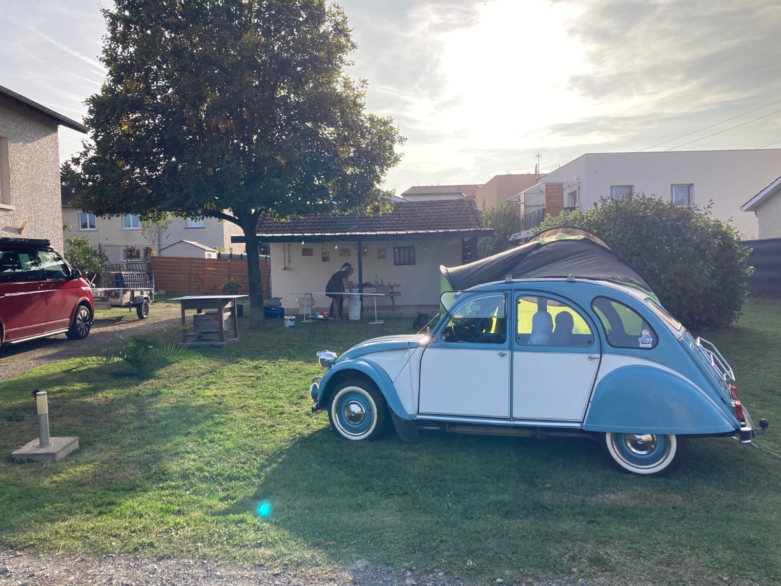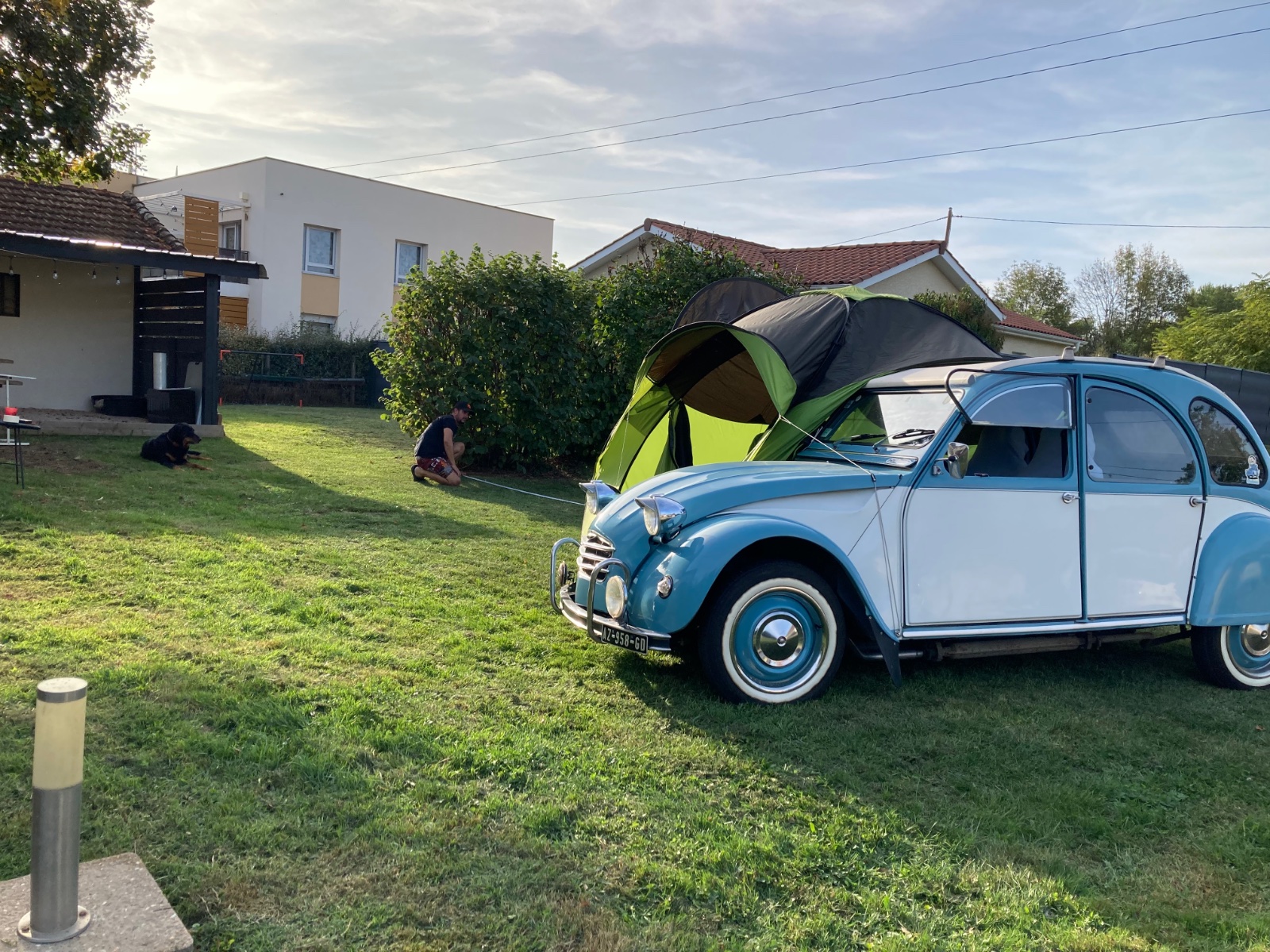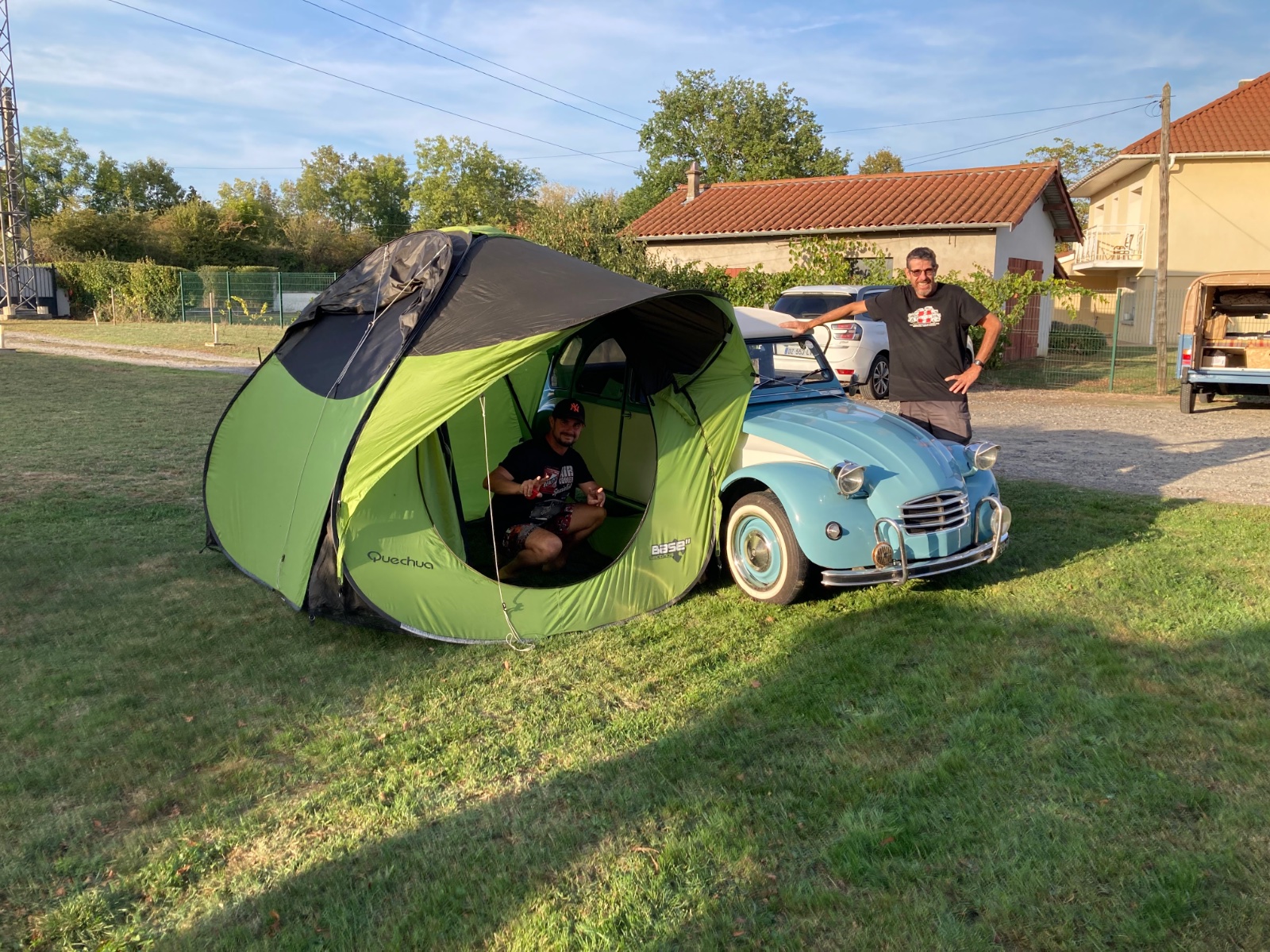 Quelques photos de la mise en place de la voiture et de la toile de tente qui nous a occupé un moment :mrgreen: