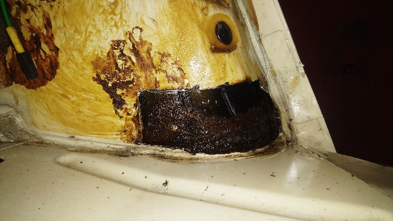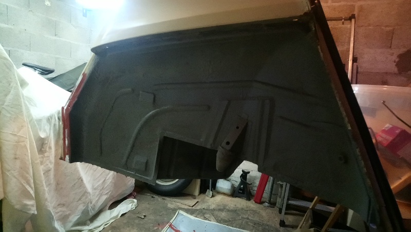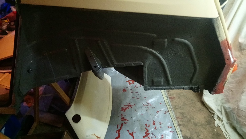 J'ai gratté vers les fixations de ceintures AR. En enlevant la tôle intérieure, il s'avère que le renfort situé derrière n'est pas si pourri. Partant de ce constat, j'innonde la zone de Rustol jusqu'à deborder.