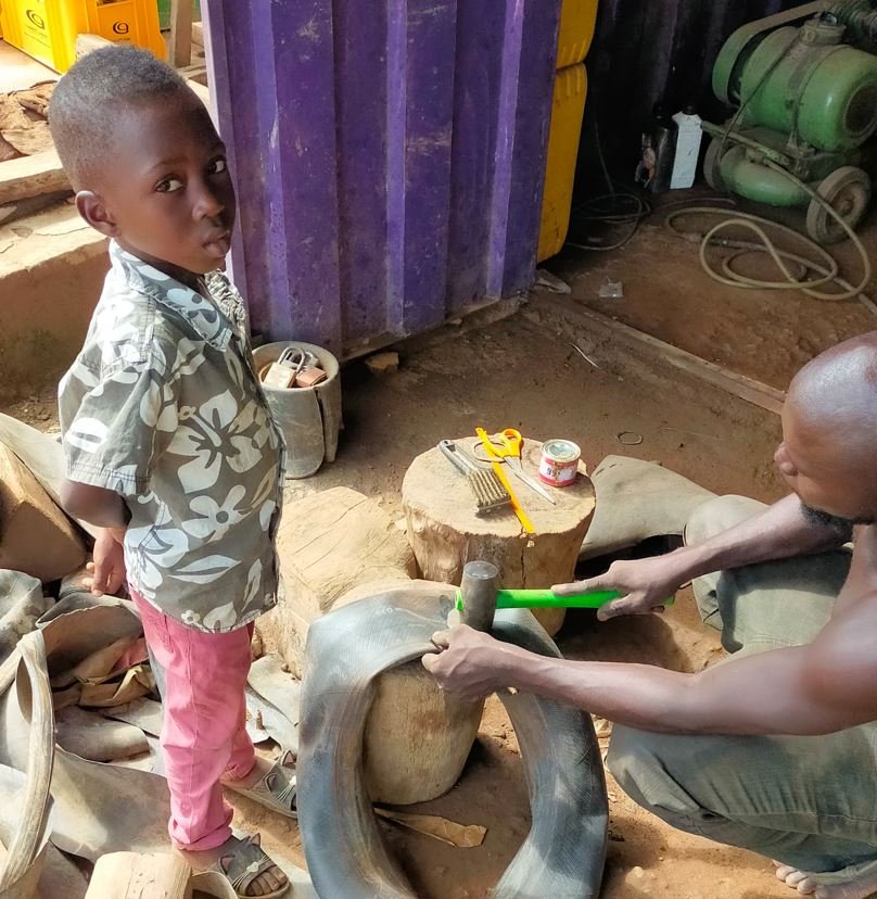 Après dépose de colle néoprène, collage à grand coup de maillet sous l'œil attentif de son fils.