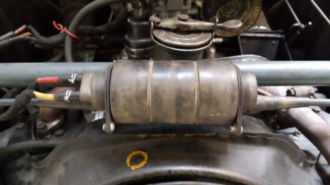 Pour ne pas ajouter un filtre moderne sous le capot, j'ai ajouté mon filtre directement en sortie de réservoir sous la trappe.