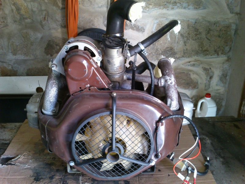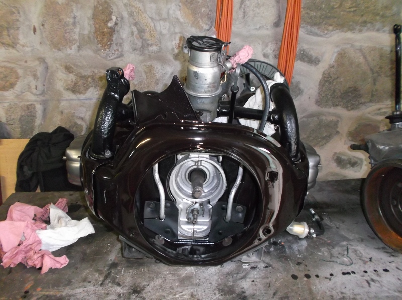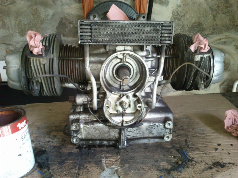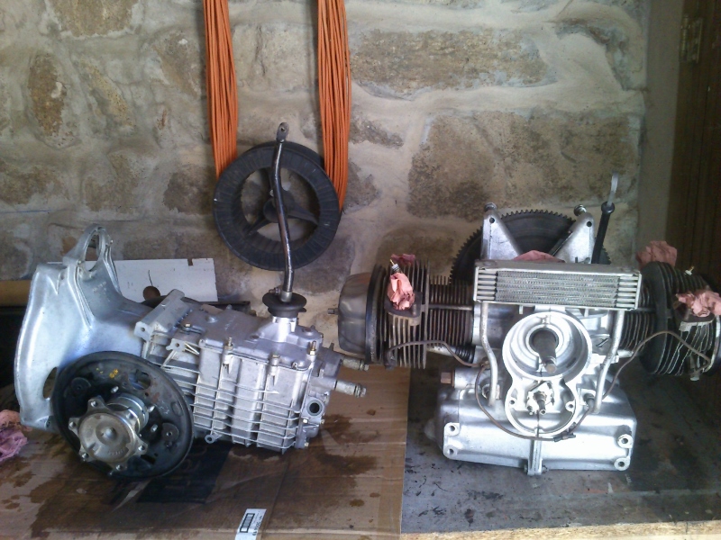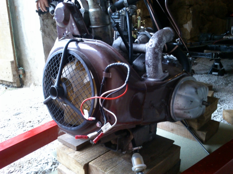 Je poursuis aujourd'hui avec quelques photos du moteur d'abord. Après dépose de celui-ci et vu qu'il semble n'avoir que peu de kilomètre. De plus depuis les réparations effectuées sur l'allumage et la carburation, il tourne plutôt bien et monte dans les tours, je me suis contenter de le débarrasser de ces périphériques et de lui faire une toilette. J'ai mis la main sur une BV de 2CV4 (avec les 2 rainures sur l'arbre primaire côté embrayage). Erreur de ma part, je me suis là aussi contenter d'une toilette et de refaire les freins... J'aurai dû pousser un peu plus et refaire les joints après contrôle du serrage des roulements AR, car aujourd'hui soit 4 ans après cette boite se met à chanter quand je suis sur le frein moteur. Erreur de débutant...