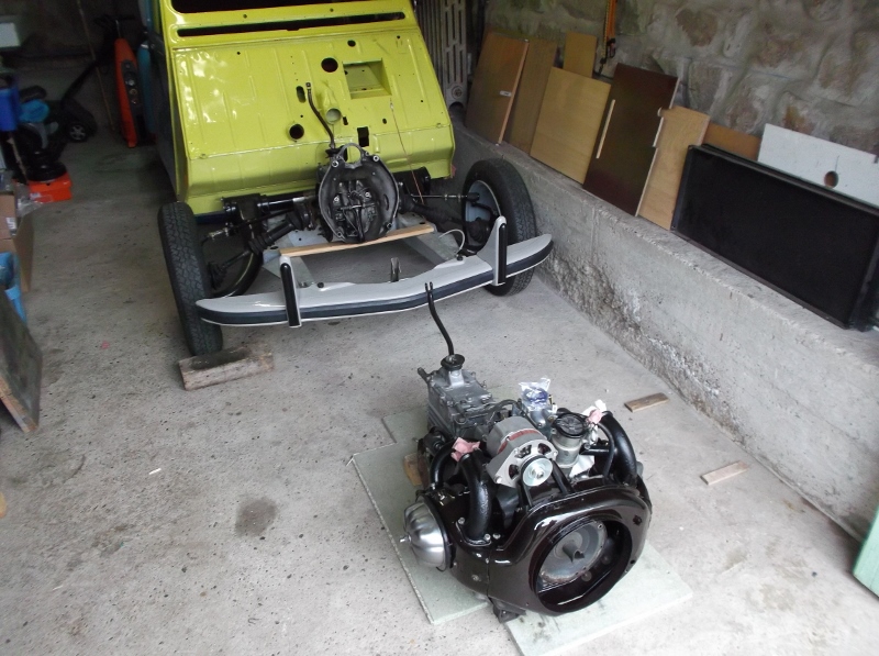 C'est tout de même super pratique, la 2CV ! On prend le moteur à 2 mains on le pose sur une table, pareil pour la boite de vitesses et hop on travaille à son aise assis, c'est à la bonne hauteur, facile à bouger et tout. Génial !