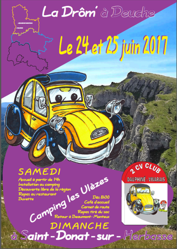 Nous avons déjà abordé le sujet en réunion mais voilà les premiers éléments transmis par nos amis drômois concernant l'organisation de la prochaine rencontre des clubs 2 CV rhônalpins qui se aura lieu les 24 et 25 juin prochains