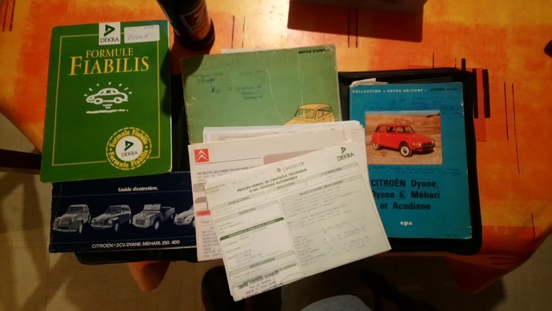 L'arrivée de cette DYANE s'est faite dimanche matin. Elle est venue de ses propres moyens et n'a posé aucun souci mécanique. Lors d'une promenade l'après midi, cela s'est un peu compliqué, le condensateur est certainement en cause. Bref une fois rentrée et mise à l'abris, je commence à me consacrer à la lecture du dossier factures de la belle :
