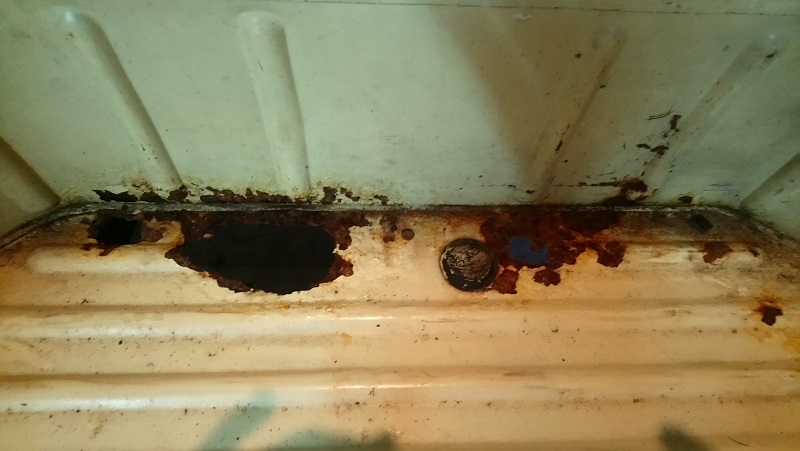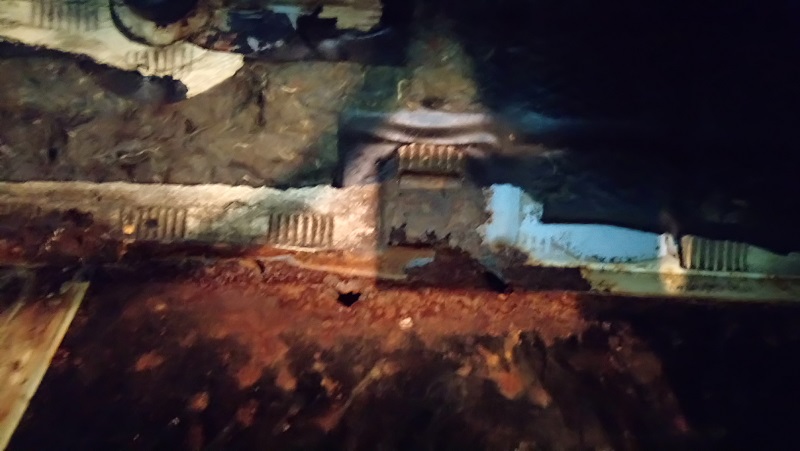 Même si le véhicule semble peu kilométré aux dires de ces justificatifs, il y a tout de même du travail à entreprendre. J'imagine qu'elle était à l'abris durant ses premières années quand elle vivait dans le 92, mais arrivée dans le 38 elle a dû connaitre la sévérité de la météo. Ce qui a conduit à quelques attaques de corrosion. Notamment le bas du plancher pédales, il faut dire que l'espèce de sac gris renfermant une mousse insonorisante n'y est peut être pas pour rien ainsi que le liquide de frein. Les deux ont fait œuvre. Le fond de coffre dans sa partie la plus en avant, auprès des trous d'évacuation, a subi les mêmes affronts. Alors il faut bien se remonter les manches et se sortir les doigts du c.l...