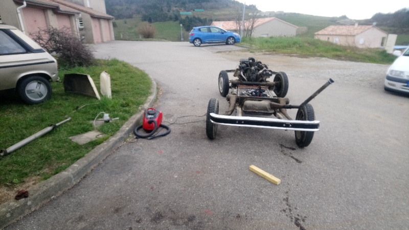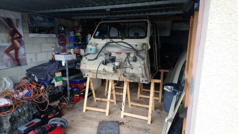 La suite de la journée de Lundi. Avec l'aide d'un palan récemment acquis, merci Clément, je monte la caisse sur 4 tréteaux bois afin d'avoir une position de travail plus adéquate, comme Sheila !