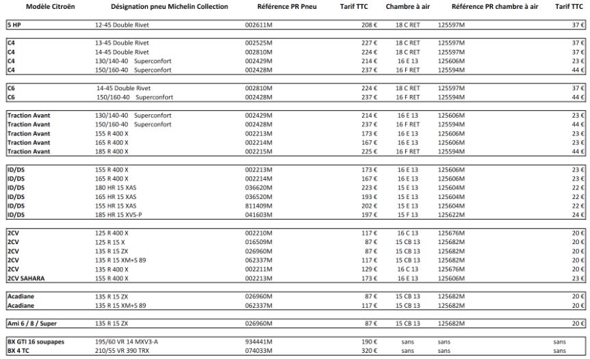 Ci dessous la liste des prix: donc ça fait le pneu de 2CV 125 x 15 à 87 € x 0.75 = 65.25€ à condition d'en prendre 4...