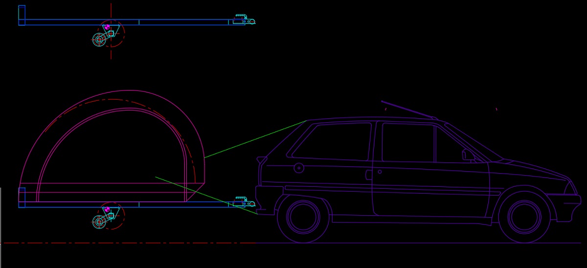 Il faut que la ligne de la caravane suive un peu celle de la 2CV, la forme goutte d'eau des teardrops va bien pour cela. Pour me faire une idée, je retrace donc le profil d'une 2CV et associe les 2 comme si elles étaient attelées.
