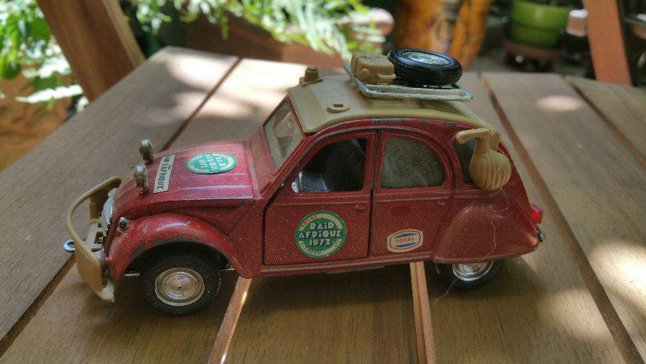 Je suis retournée aux puces ce matin, voici ma petite trouvaille que j'adore, en métal , la 2cv "Raid Afrique 1973" Il manque les 2 phares avant et les autocollants RTL mais je devrais pour les refaire au boulot, grâce aux livres que j'ai acheté à Pierre Lacasta, j'ai une image de référence.