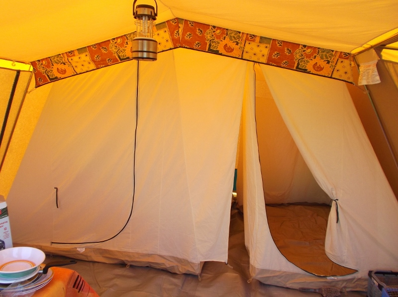 Je me sépare de ma tente de camping de marque Cabanon (vendue sous l'écusson Destinéa...réseau équipement de camping). Toile en coton pour les murs, toit et toile à pourrir en bâche PVC haute densité, toile des chambres en coton. Armature diamètre 20 mm en acier bichromaté (schéma d'armature comparable à celui d'un auvent de caravane)...robustesse et facilité de mise en place. Espace chambres séparées, une de 3 personnes maxi et une autre de 2 personnes maxi. Espace penderie entre les 2. Espace séjour et extension cuisine. Façade roulable et un côté roulable également pouvant se transformer en pare-soleil. Vélum de toit pour les fortes chaleurs. Rideaux à motifs sympa ! Aspect vintage.
