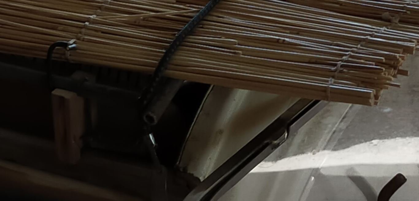 Grâce à la rehausse du portique de capote, il n'y a plus de collision avec les vitres ouvertes, donc je peut garder le maximum de largeur de paille. la limite étant l'espace sous le siège arrière entre les 2 portières. (place de rangement) J'ai ajouté aussi 2 petits crochet pour que le vent de face pas reculer la paille.