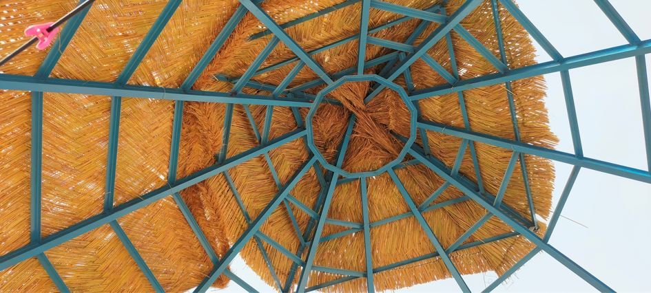 Ce matin, pose de la paille sur le haut de la grande paillotte: