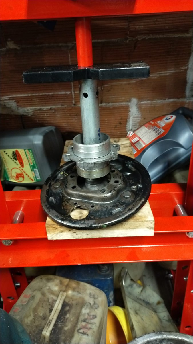 j'ai repoussé le piston bloqué à l'aide de l'étau et des écrous empilés, pour le faire sortir de l'autre coté
