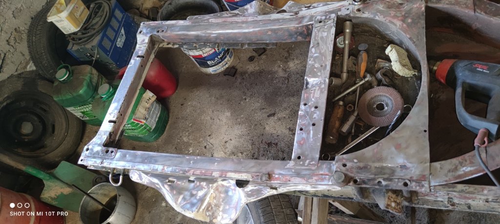 J'ai remarqué que les AK400 n'ont pas cette traverse, je me demande si je vais pas la virer car de toute façon j'arriverai pas à la remettre d'aplomb... À moins de récupérer celle sur le châssis de la verte, ex blanche, et futur bleue ! J'ai viré la tôle sous moteur. J'ai découpé ça comme un vrai porc ! J'affinerai quand j'aurai retourné le châssis Pause douche ! Puis bière !!