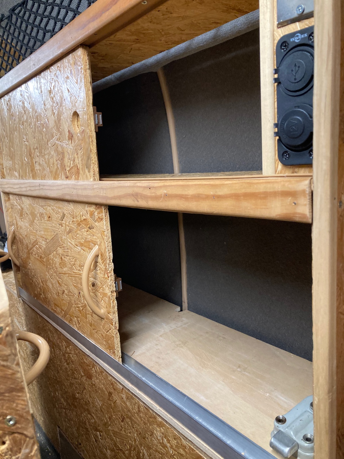 L’aménagement terminé juste à temps pour le départ avec Le tiroir pour le réchaud et la table modifiée dans le placard de gauche À fin de s’adapter à la nouvelle hauteur du caisson.