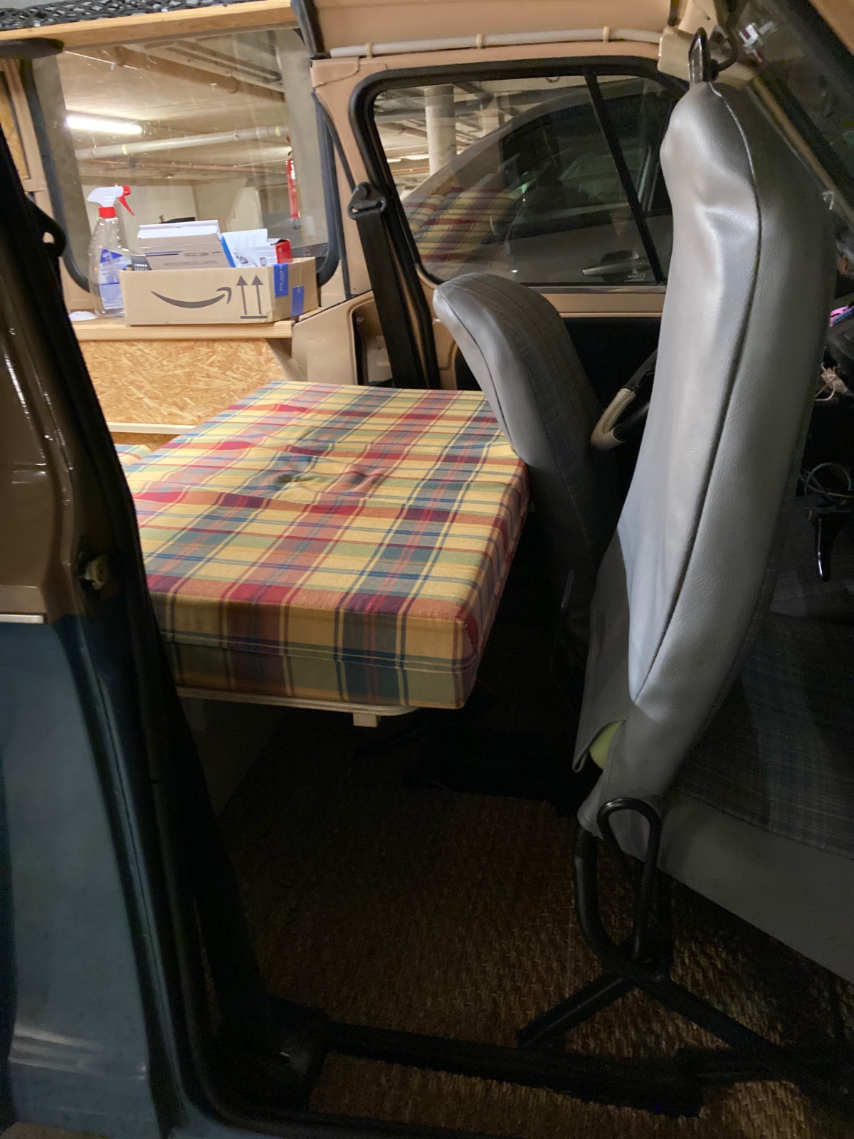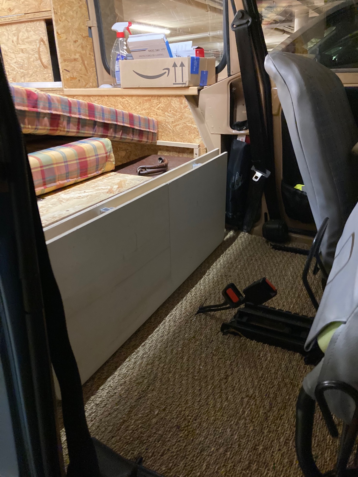 Avant de fixer les placards latéraux, je finis par habiller les côtés avec de la moquette d’où vous savez … 😁