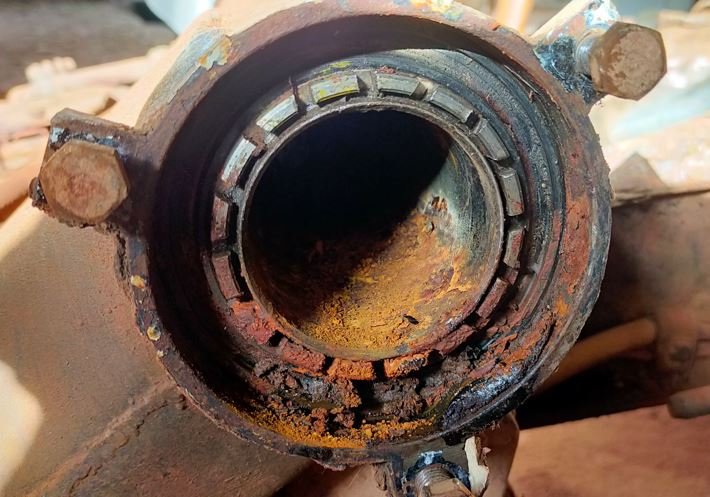 J'ai retiré les couvercles de protection des roulements de bras: on voit bien le niveau d'eau qui a stagnée à une époque