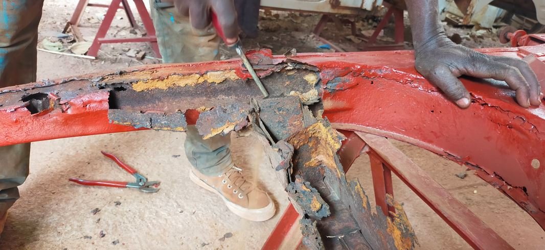 Ce matin, j'ai commencé par peser le châssis avant d'enlever les tôles pourries.