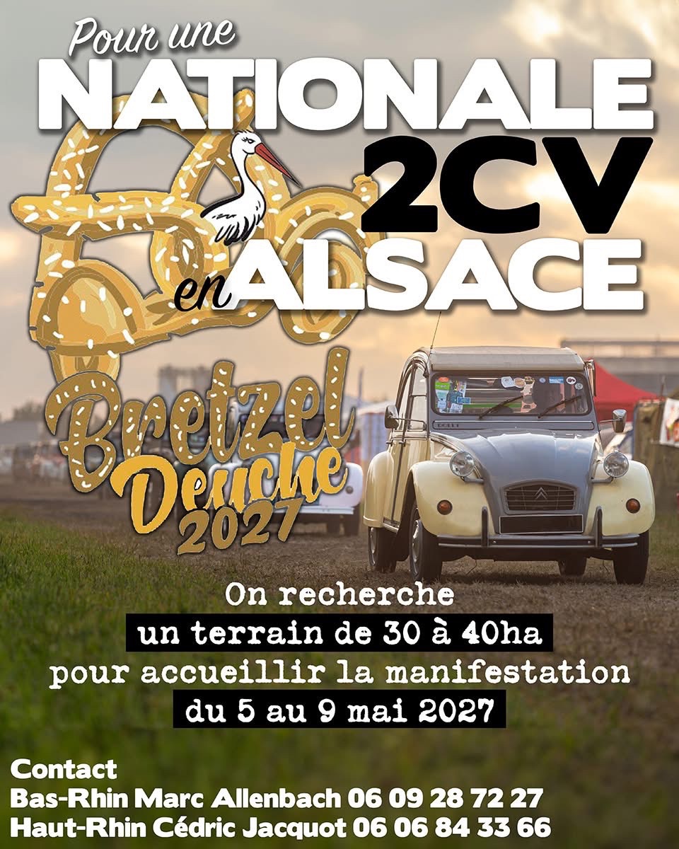 AVIS DE RECHERCHE ! Pour organiser la Rencontre Nationale des 2CV Clubs de France en 2027 en Alsace, nous sommes à la recherche d'un terrain de 30 à 40ha pour accueillir la manifestation. Élus locaux : cet évènement est l'occasion de réunir environ 3000 2CV venues de toute la France. Elle attire des dizaines de milliers de visiteurs et le temps du week-end de l'Ascension votre commune se retrouvera sous les feux des projecteurs... Mais nous avons besoin d'un terrain dès maintenant. Merci de nous contacter si vous avez quelque chose à nous proposer de concret en Alsace. Nous n'avons pas besoin d'idées ou de suggestions (nous recherchons activement depuis un an), il nous faut un terrain qui pourra accueillir cette rencontre qui a lieu depuis 1993 chaque année dans une autre région de France. L'équipe de "Bretzel Deuche 2027" réunit des membres des clubs de 2CV de toute l'Alsace : nous avons toutes les bonnes volontés nécessaires mais sans terrain nous ne pouvons rien faire. Amis Alsaciens : merci de partager ce message !