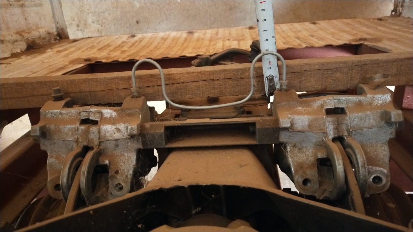 Ce matin, grand déballage et suppression de toute la poussière accumulé depuis 1 ans. Après j'ai mesuré la hauteur de la connection des étrier arrière par rapport au plancher du fourgon. ça dépasse de environ 5 cm.