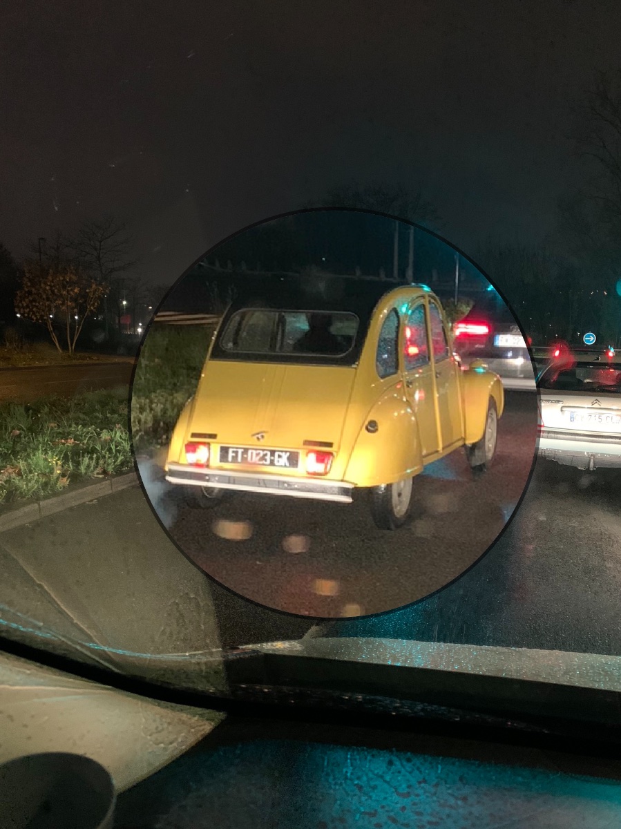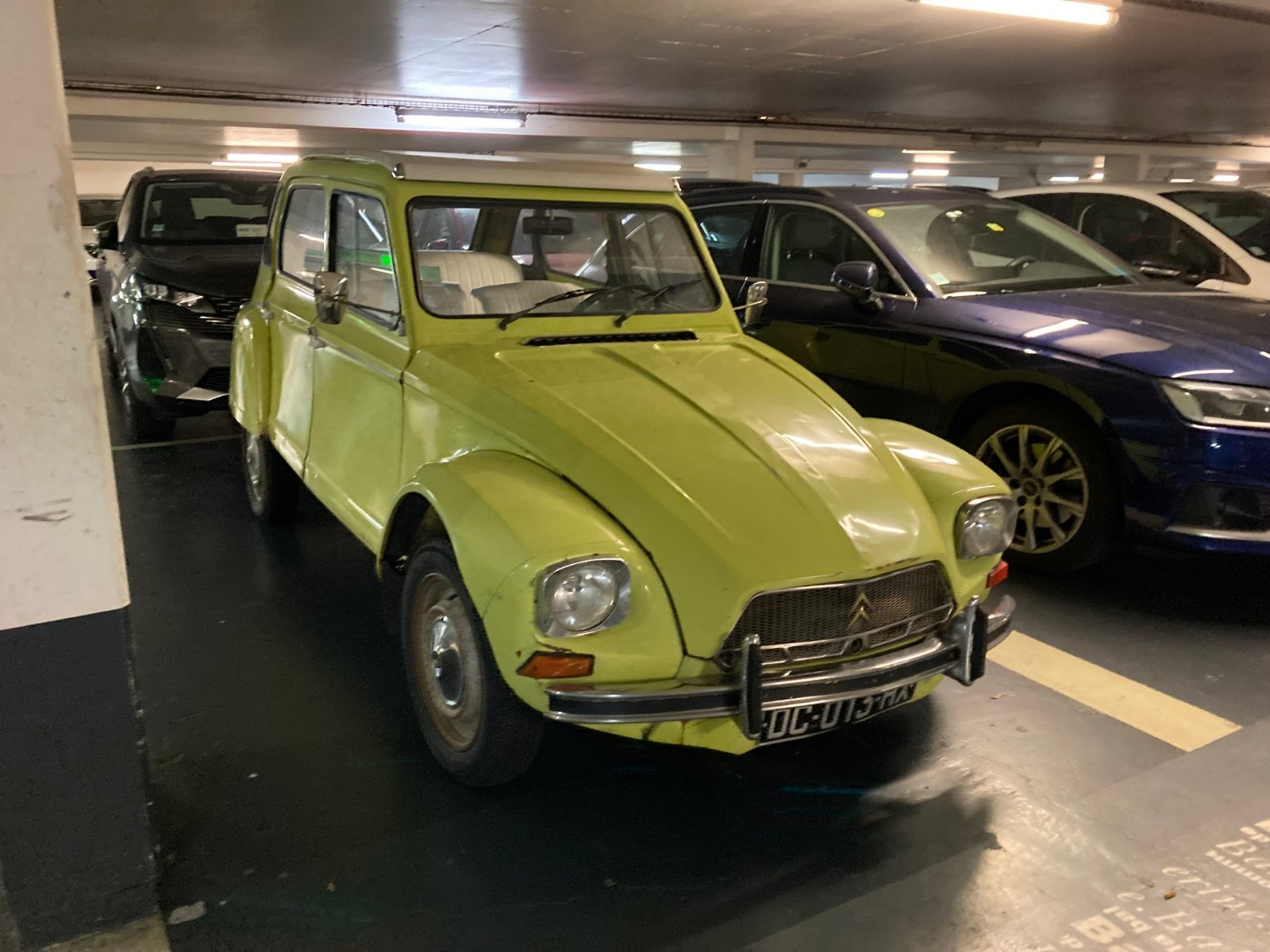 Une belle (et rare) (je crois ne jamais en avoir vu !) Dyane jaune Cédrat croisée dans les sous-sol de la citée internationale.