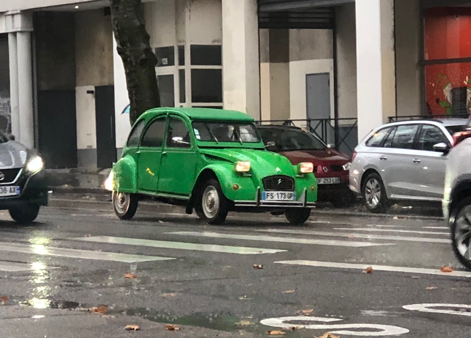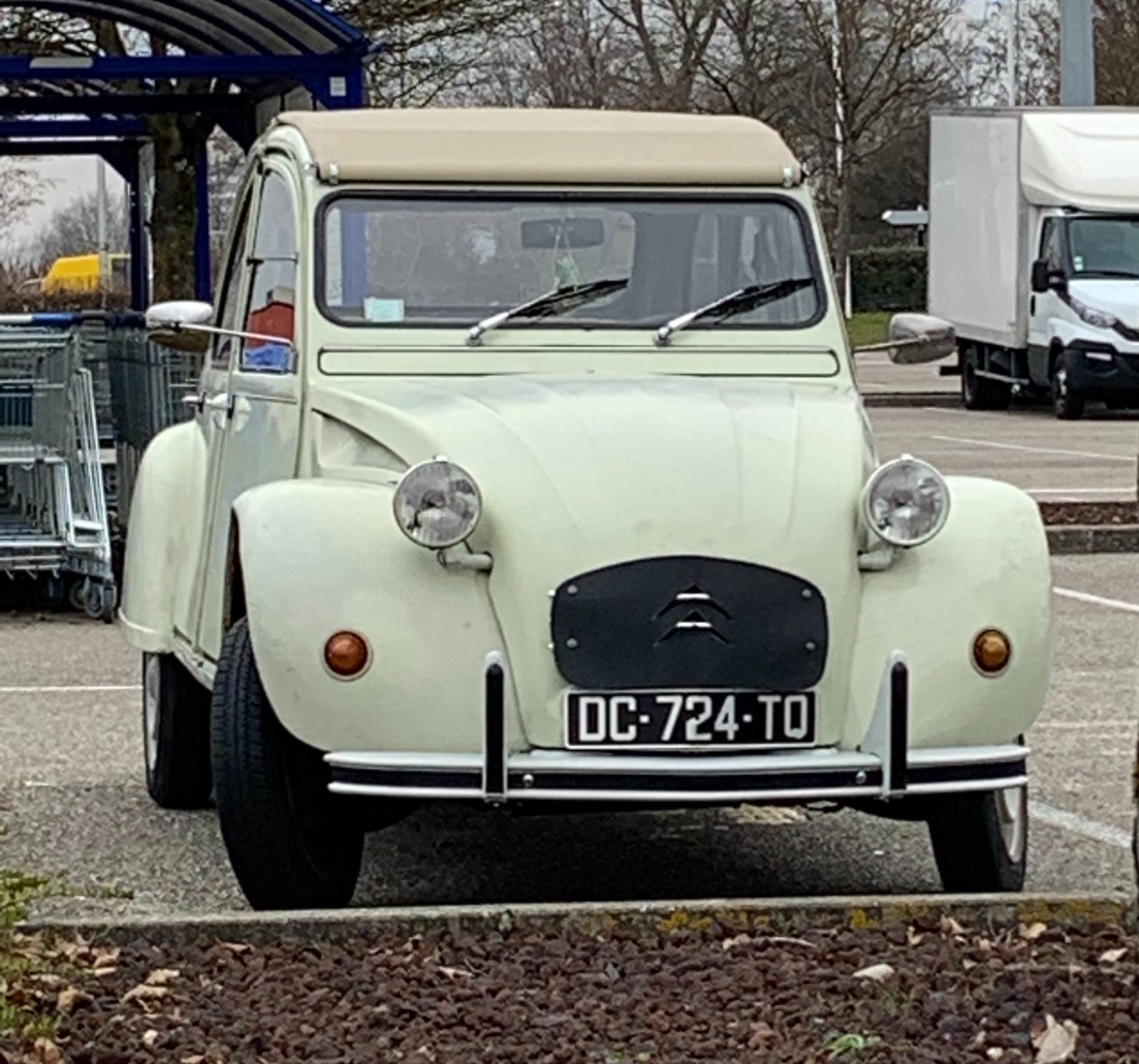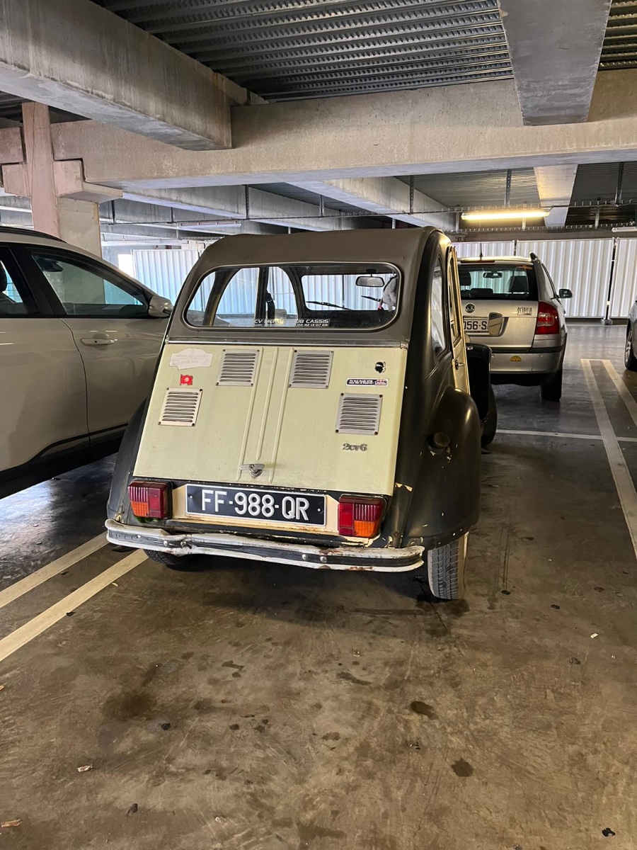Superbe cette 2cv d'avant 1975 ! Petits pares-chocs; monogramme en relief; barre d'optiques "courtes"; charnière de malle avec l'inscription Citroën; joncs sur les bas de caisse; cuvelage des clignotants et supports des feux arrière en gris rosé ! Par contre il faudrait mettre les bavettes, cela protège beaucoup l'auto !