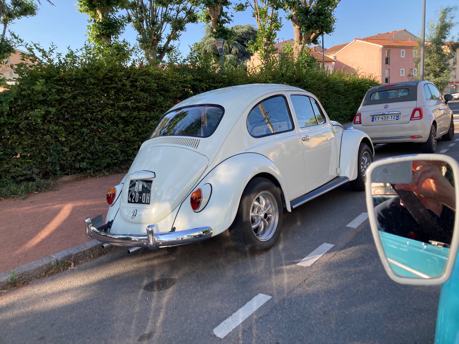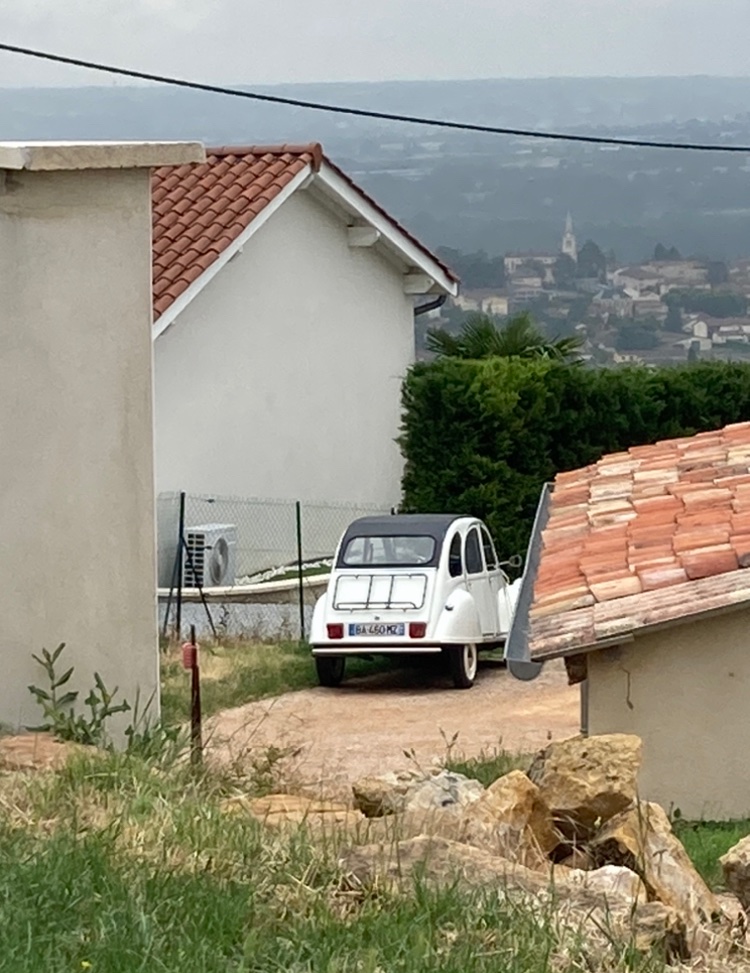 ce dimanche matin , je profite de rallonger mon trajet et me balade en bicylindre , sur une petite route de la commune de St jean des vignes , j’aperçois une deuche blanche garer dans la cour d’une maison ,