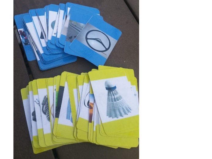 jeu de cartes qui peux se faire a l'intérieur sur une table, il y a 2 tas de cartes , les bleus ce sont des éléments de 2 cv en photo, et les jaunes ces sont des objets "autres" qui sont des synonymes par rapport aux objets de la 2cv