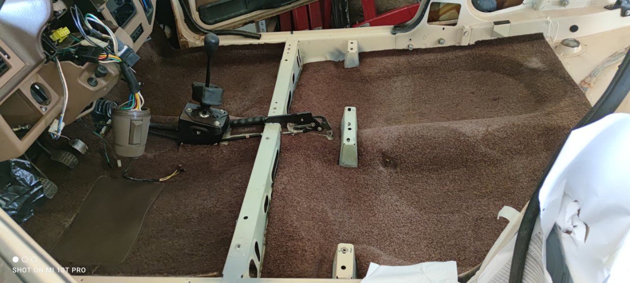 Poursuite avec la repose des garnitures plastiques qui fixent les moquettes. Elles sont plus nombreuses sur une 11R. Nouveaux habillages de montants de pare-brise / pied milieu / ceinture de pavillon en imitation skaï marron (rien à l'origine sur base) et avec l'ajout de poignées de maintien avec crochets porte vêtements aux places AR ! Siouplait !