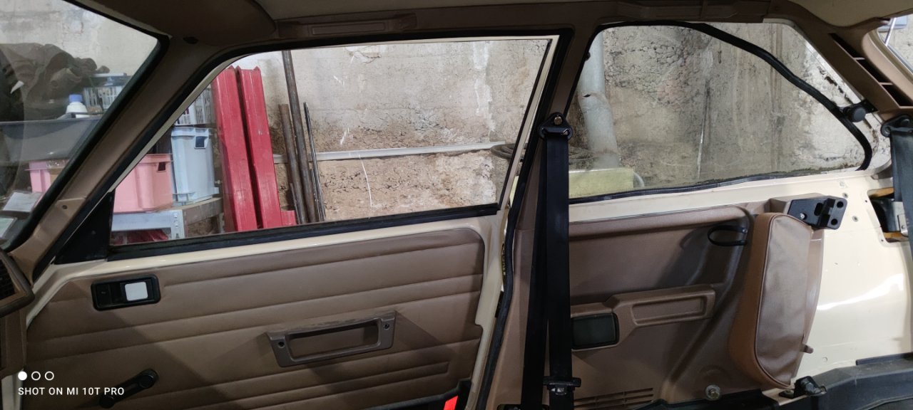Dépose des vitres AR fixes pour les remplacer par des entrebaillables. Côté conducteur, on voit bien de nouveau que l'aile a été remplacée. Les points de soudures, la rouille de surface et la peinture Beige Atlas au pinceau à certains endroits.