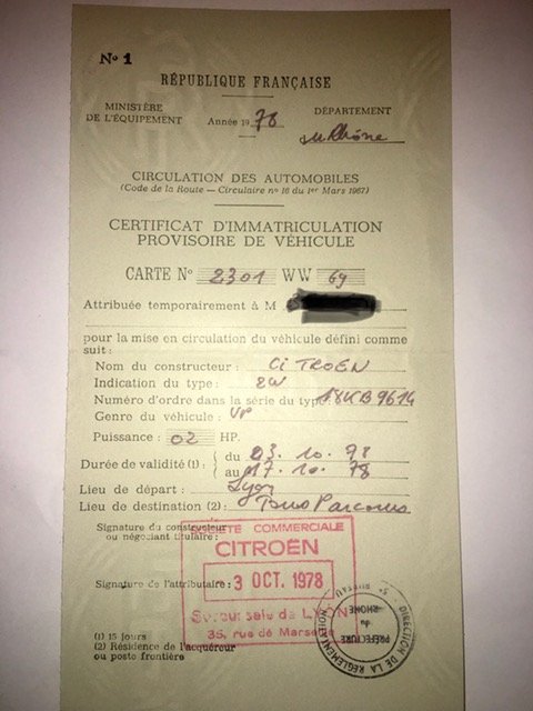 En lisant la notice technique récupérée chez une collègue, j'ai trouvé cette notice d'emploi et ce certificat d'immatriculation provisoire de la 2CV de ces parents.