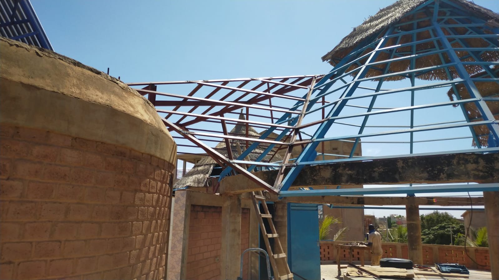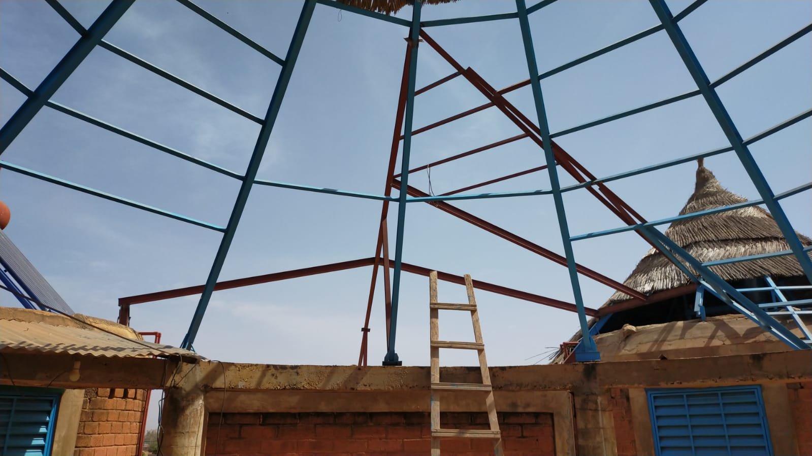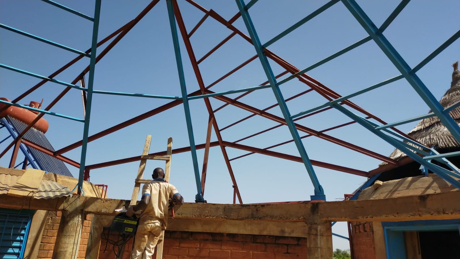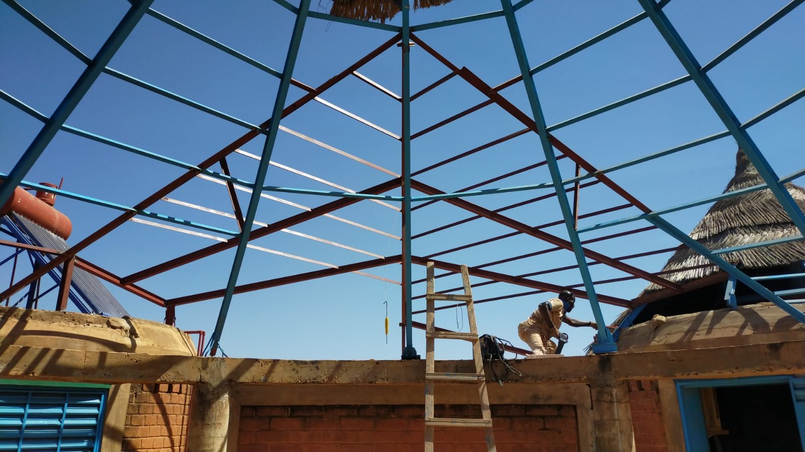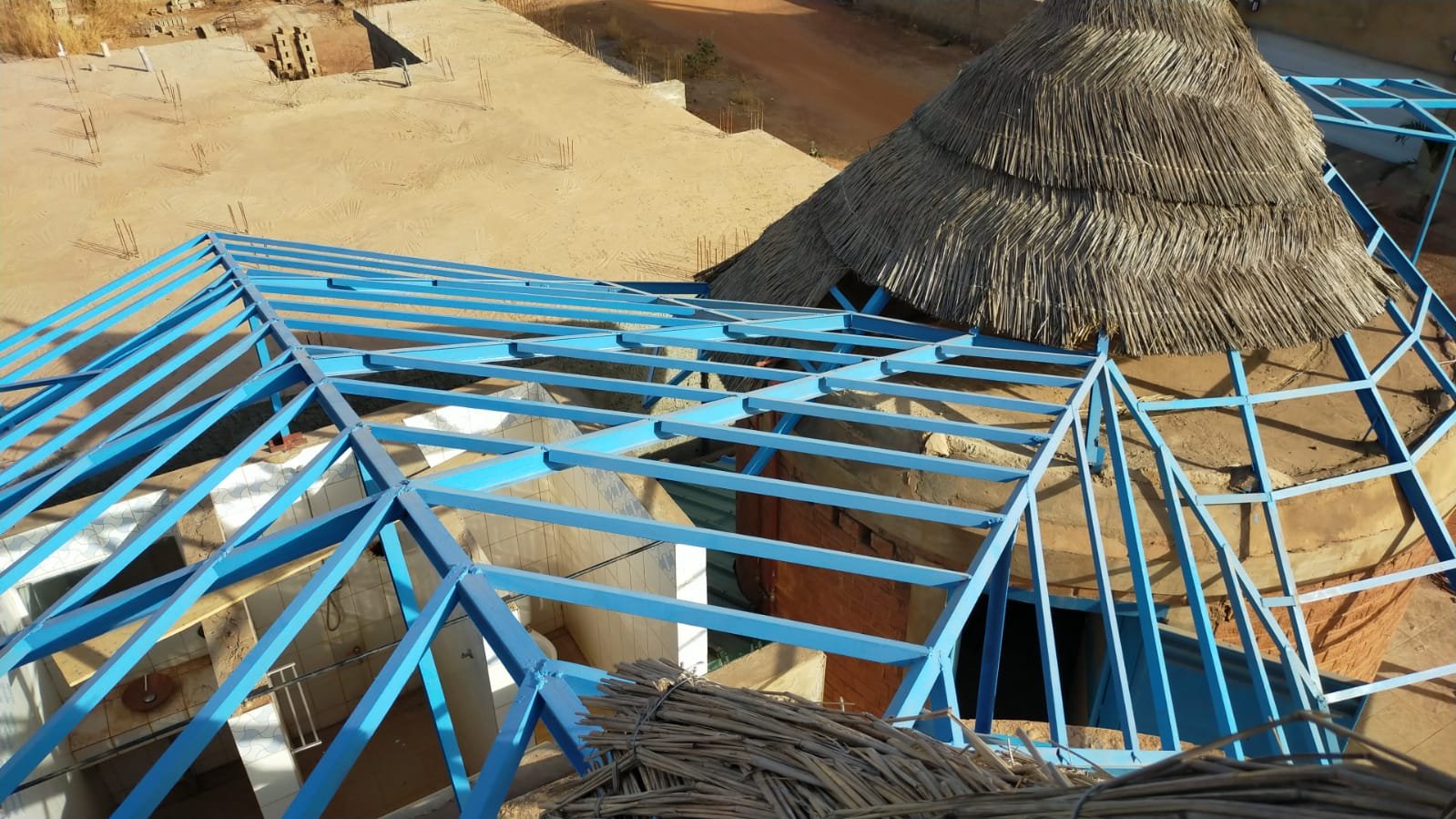Avancement du travail sur la charpente métallique au dessus des toilettes: