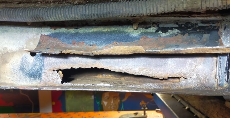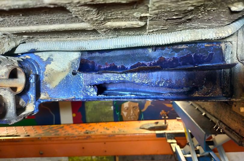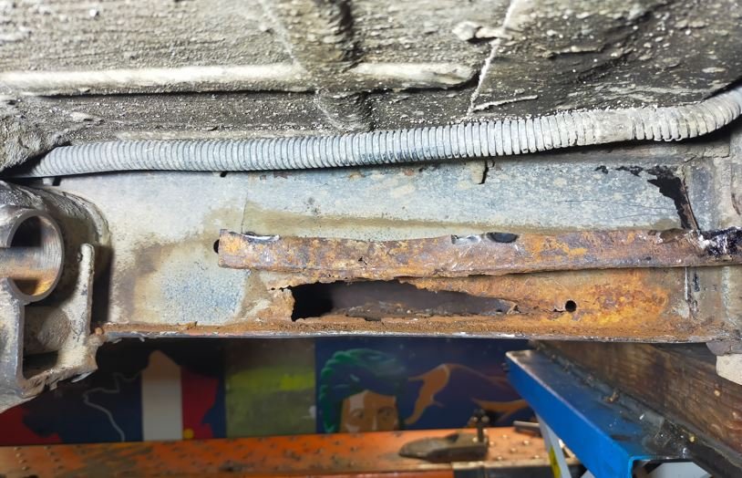 Une fois l'amortisseur et le pot retiré, j'ai pu voir que du côté droit, la tôles est bien mal en point.
