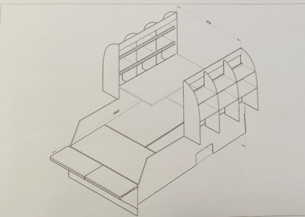 Une table, deux coffres sous banquettes dont un avec un tiroir et 2 étagères de rangement. Une extension vers l'avant relevable qui imposera des sièges rabattables à définir.