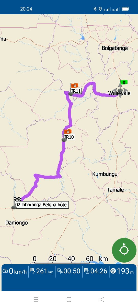 Voici le trajet d'hier. Si j'avais fini à Tamale comme prévu le avant hier, le trajet aurait été bien plus court. Comme je n'ai pris que des pistes, ça a rallongé.